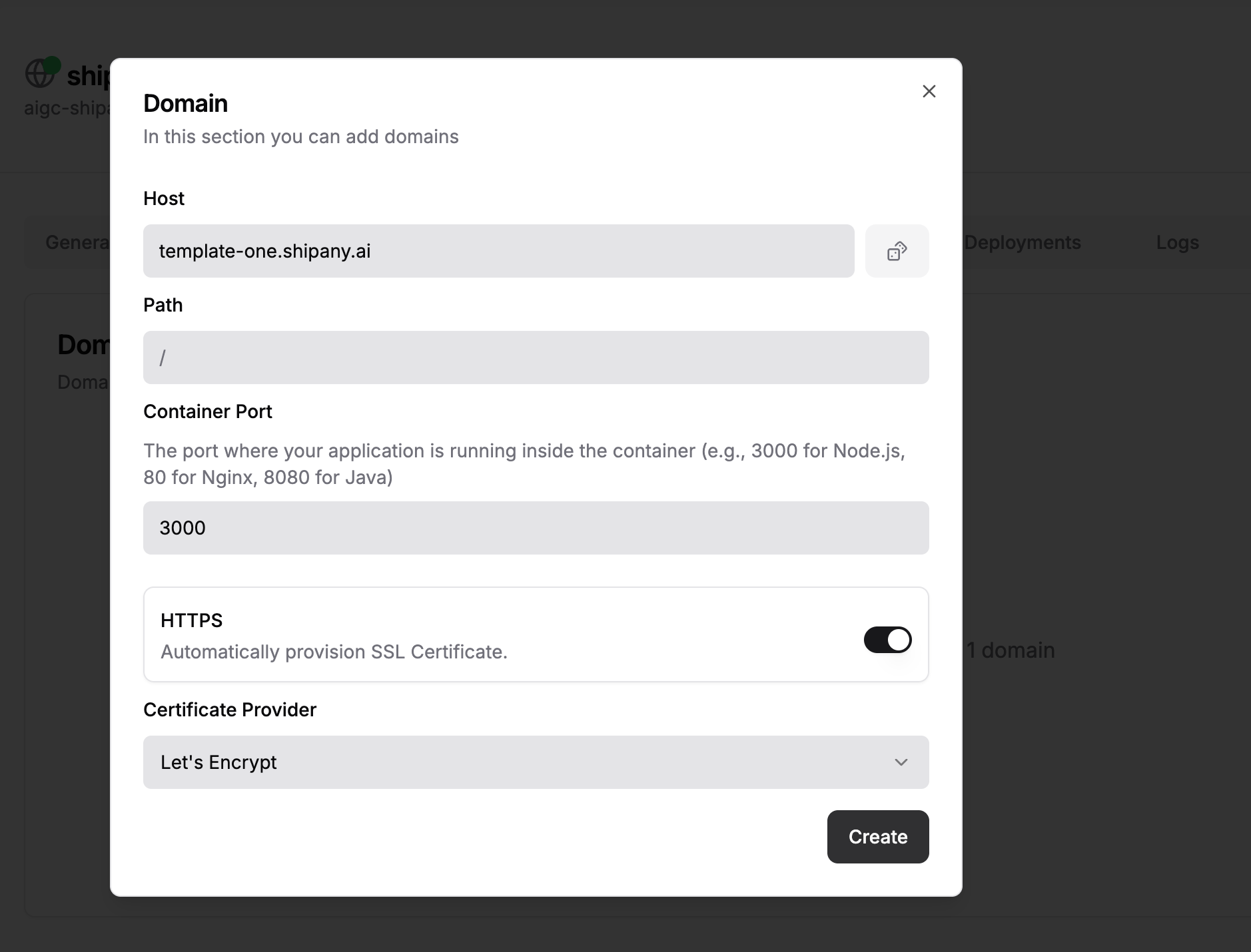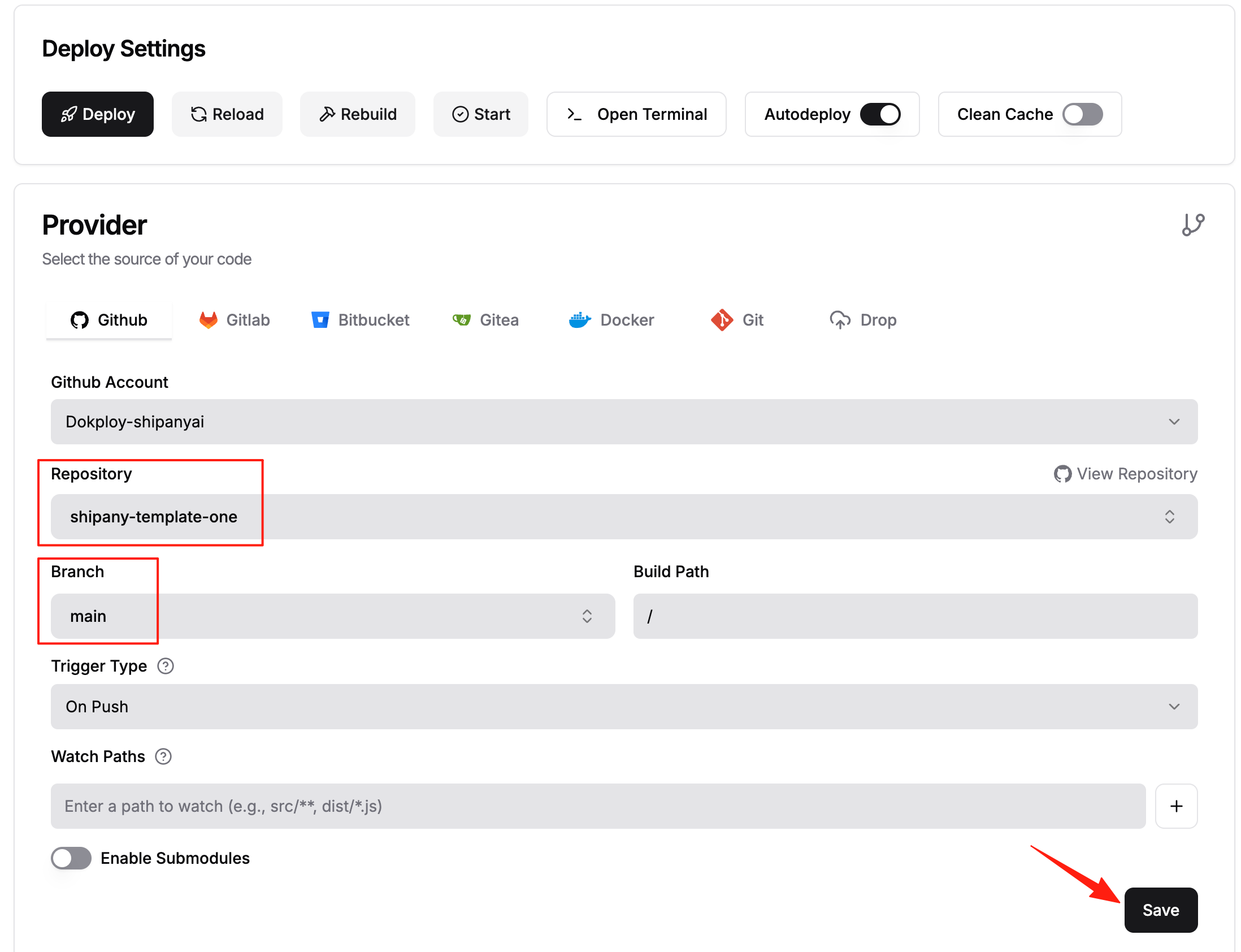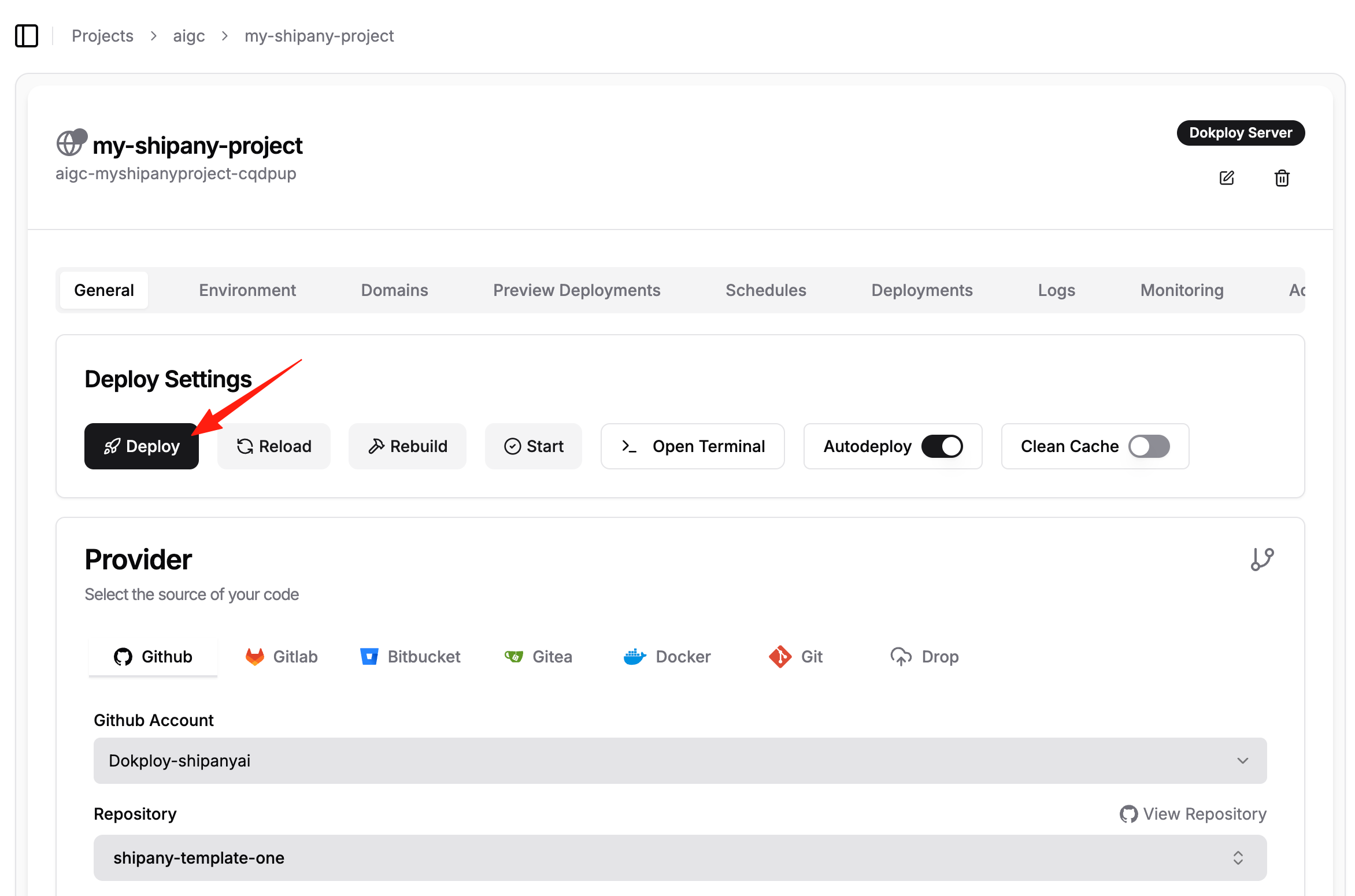 - Enter the project, bind your Github account, select the repository based on the shipany-template-one template, and save the configuration