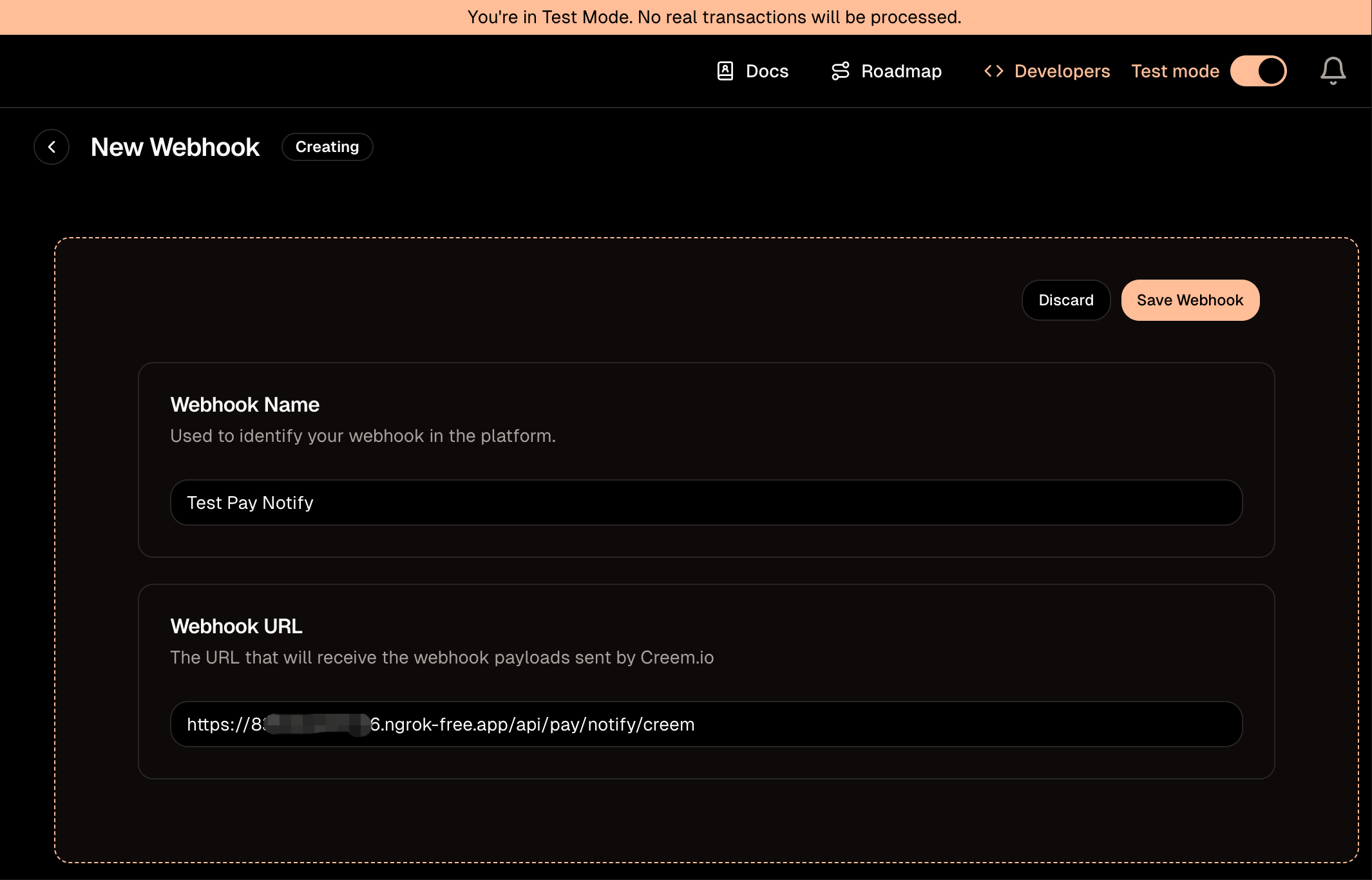 - You need to first configure the Webhook address in the Creem dashboard configure webhook address