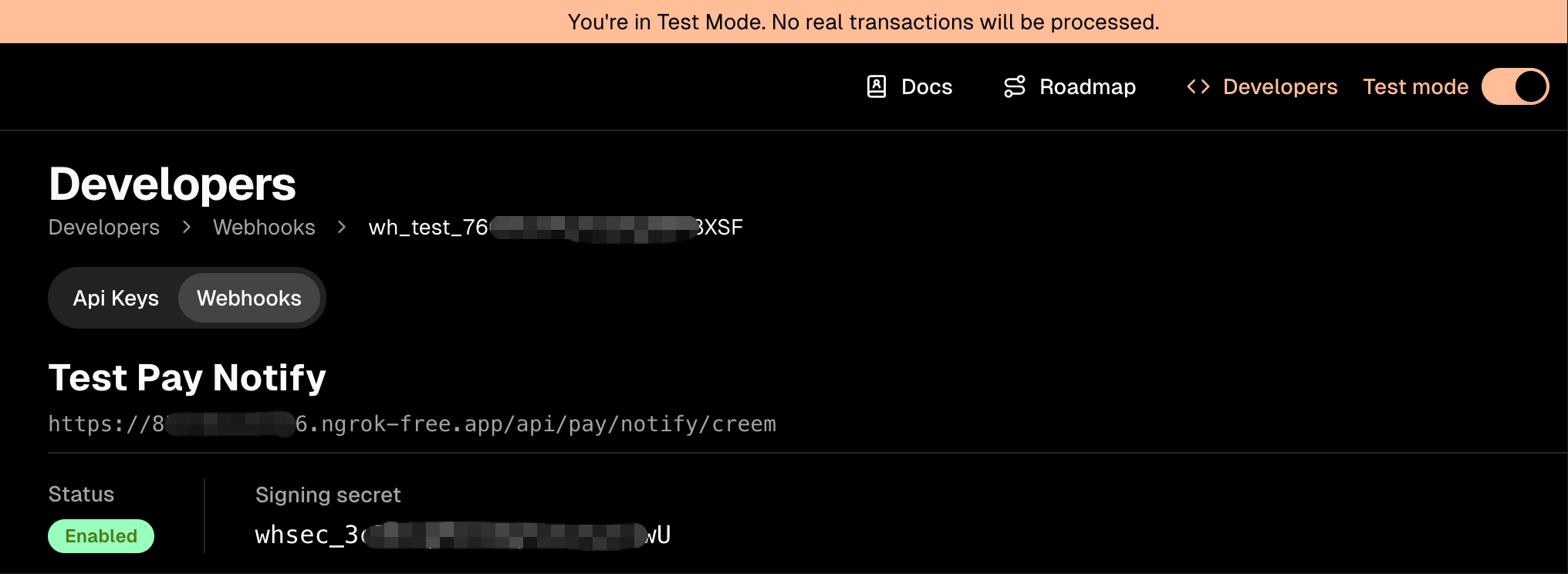 For example, configure the Webhook address as: https://your-domain.com/api/pay/notify/creem